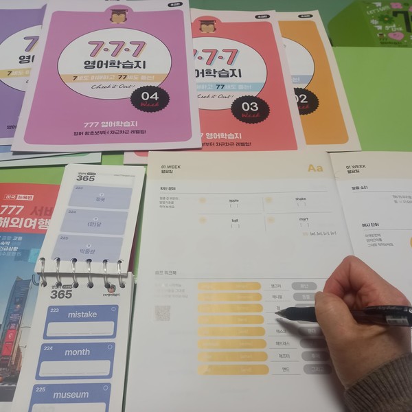 왕초보인지라 늘 시작부터가 막막해서 할 엄두도 못내고 살았는데, 777영어학습지 커리큘럼을 보니 '이거다 싶어' 용기내어 바로 마스터팩 구매했네요. 기초발음부터 단계적으로 구성되어 있고 부담감 적은 분량에, 무엇보다 시간적 제약이 없어 너무 좋아요. 덕분에 용기내었으니 열심히 해보렵니다. 왕초보님들 화이팅 입니다요~~ *^^*